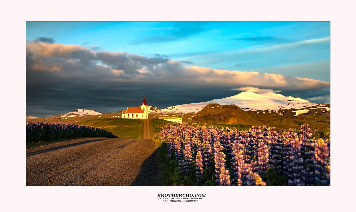 석양 빛을 받고있는 루핀이 만발한 길을 따라 오르면 언덕 끝에 빨간 지붕의 오래된 교회가 아름다운 자태를 뽐내고 있고......