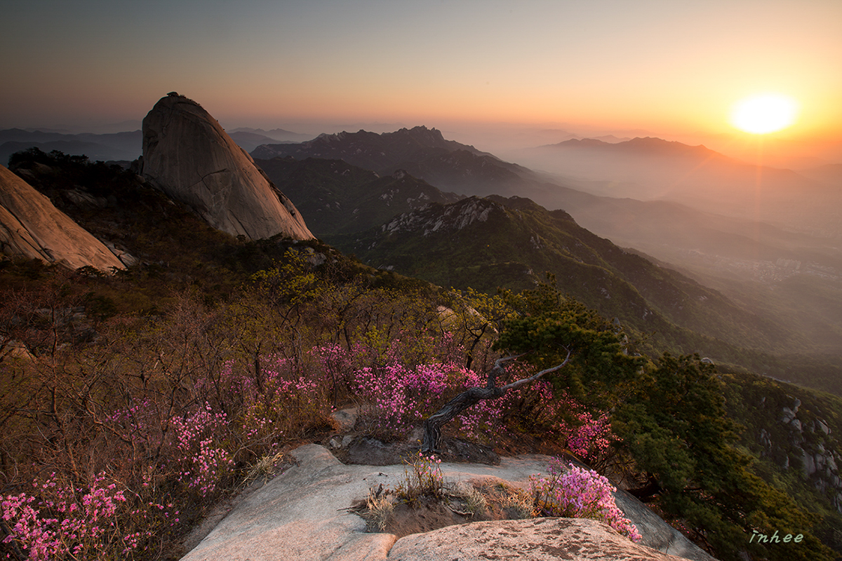 빛받은 연분홍 꽃과 대조를 이루는 큰바위 그리고 운해