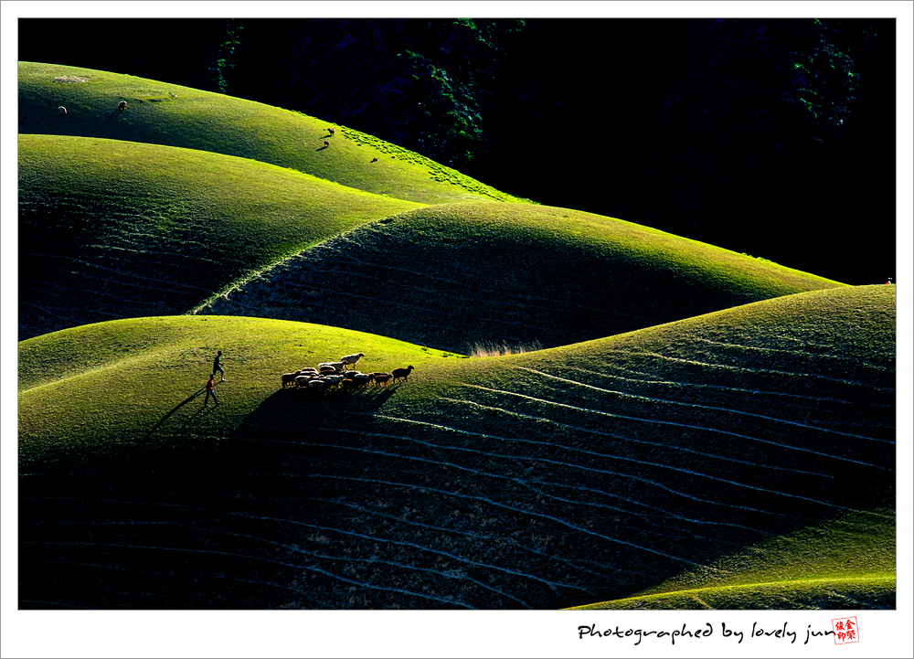 카라준초원처럼 화려한 꽃방석은 아니지만 첩첩이 주름진 계곡의 선이 아름다운 곳이 바로 쿠시대 초원이다. 일몰과 함께 서산의 빛이 비스듬히 내려올 무렵